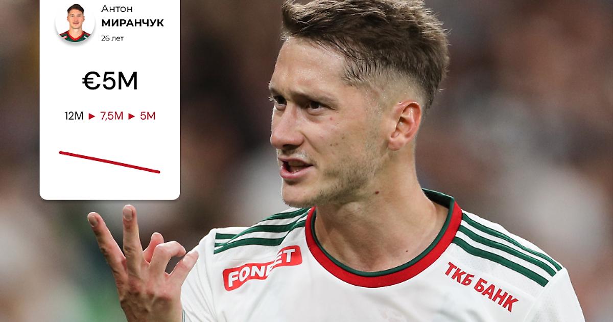 С Марадишвили схожая ситуация. Зато Миранчук, Керк, Камано и Баринов в трансферной оценке потеряли. Антон сильнее всех. Из-за травм и малого количества матчей у него за последние два года вообще пике: с 14 до 5 млн.