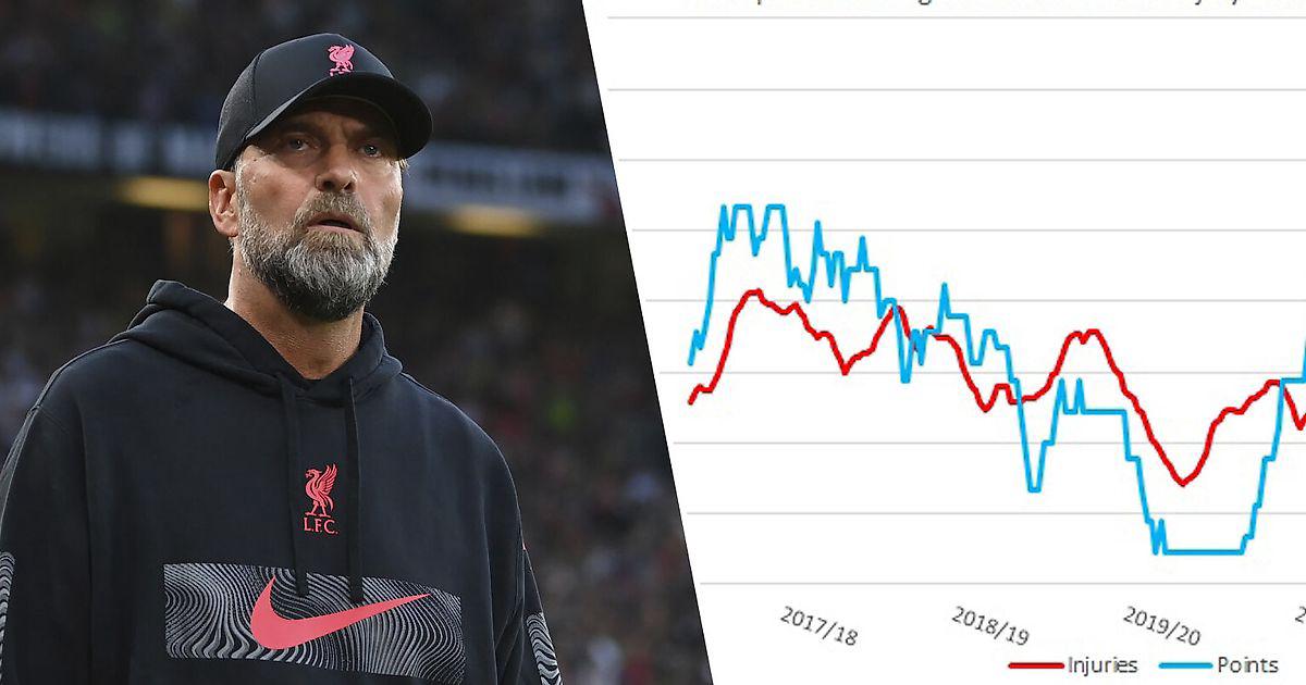 То, что это влияет на результаты, – совсем не сюрприз. У «Ливерпуля» есть аналогичный пример из сезона-2020/21 – тогда тоже был кризис травм, но на других позициях. Корреляция видна из недавнего графика журналиста Liverpool Echo Эндрю Бизли. Темп набора очков на дистанции 19 матчей (круг в АПЛ) совпадает с количеством травм: чем больше повреждений, тем хуже результаты, чем меньше травм – тем больше очков.
