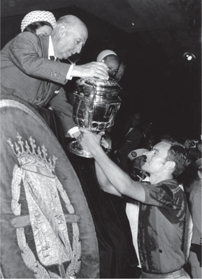 Франко вручает Кубок Генералиссимуса капитану «Барселоны» Хосе Антонио Сальдуа после скандального «Финала бутылок» в 1968 году.