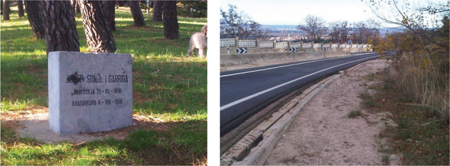 Памятный камень Суньолю (вверху слева) был установлен в небольшом, ничем не примечательном парке в соседнем городе Гвадаррама в 1996 году после долгой кампании по его официальному поминовению. Место на дороге, где был застрелен Суньоль (вверху справа). Перевалочный пункт с камнем теперь исчез, а его тело так и не было найдено.