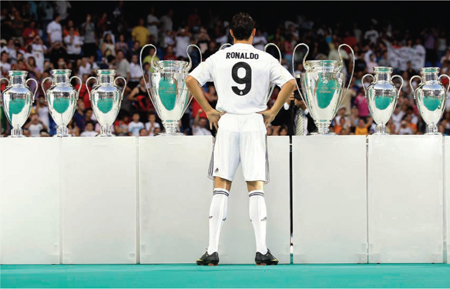 Девять Кубков чемпионов— одна навязчивая идея. Криштиану Роналду представлен перед трофеем, который определяет мадридский «Реал».