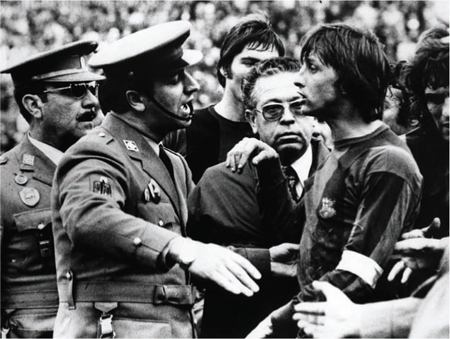 Февраль 1977 года: Кройффа сопровождает полиция с поля после удаления в матче с «Малагой». Фотография стала символичной: для некоторых в Каталонии она отражала все еще продолжающуюся в испанском обществе борьбу.