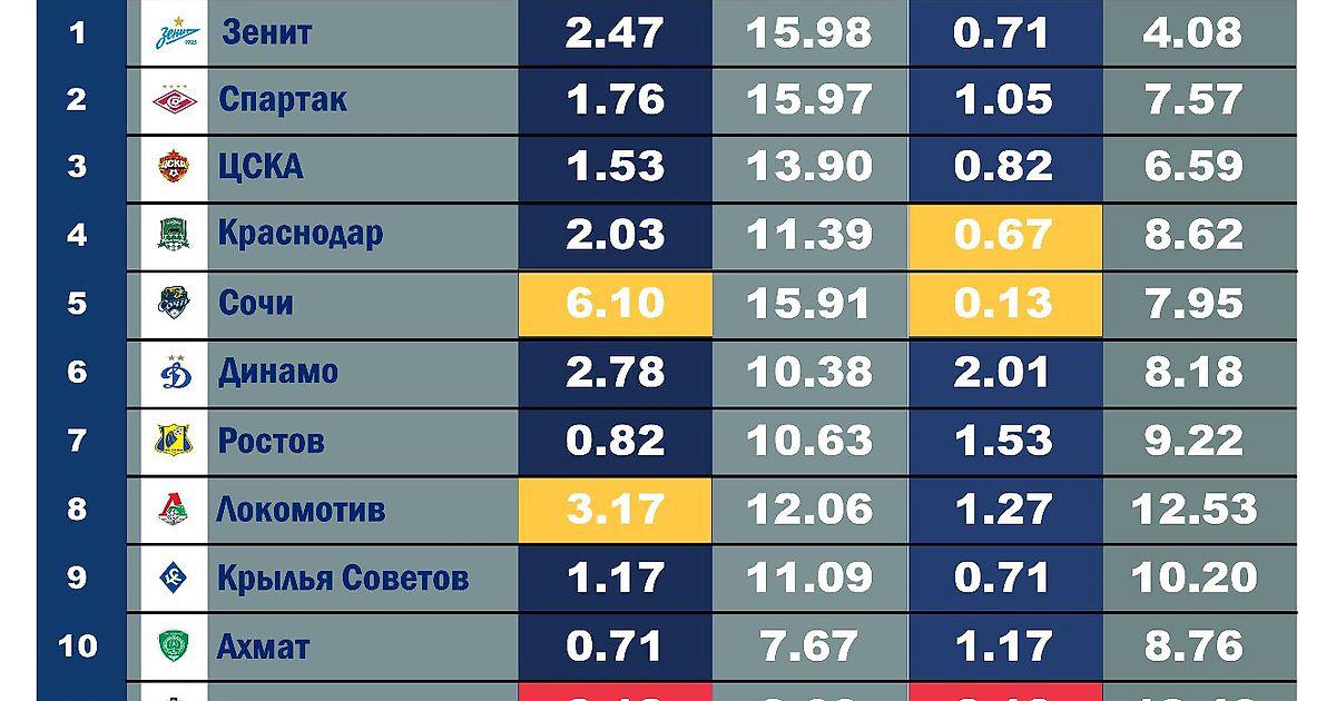В седьмом туре "Зенит" и ЦСКА лучшие по позиционной атаке, недалеко от них "Сочи", а вместе с ним "Спартак". Хочется похвалить "Крылья" - ведь их соперник из Грозного худший в туре. Дополнительно, вырисовывается и картинка, которая напрямую коррелирует с результатами команды. Два последних места в таблице имеют в совокупности 206 ODC за сезон; у "Зенита", например, этот показатель меньше всех в лиге.
