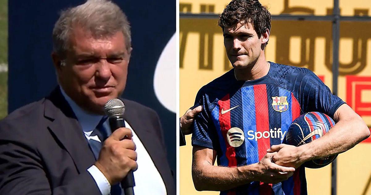 Сегодня Маркос Алонсо был представлен как новый игрок «Барселоны». На презентации испанца президент клуба, Жоан Лапорта, вспомнил, что отец защитника, которого, кстати, тоже зовут Маркос, когда-то защищал цвета каталонцев. Речь президента получилась трогательной: