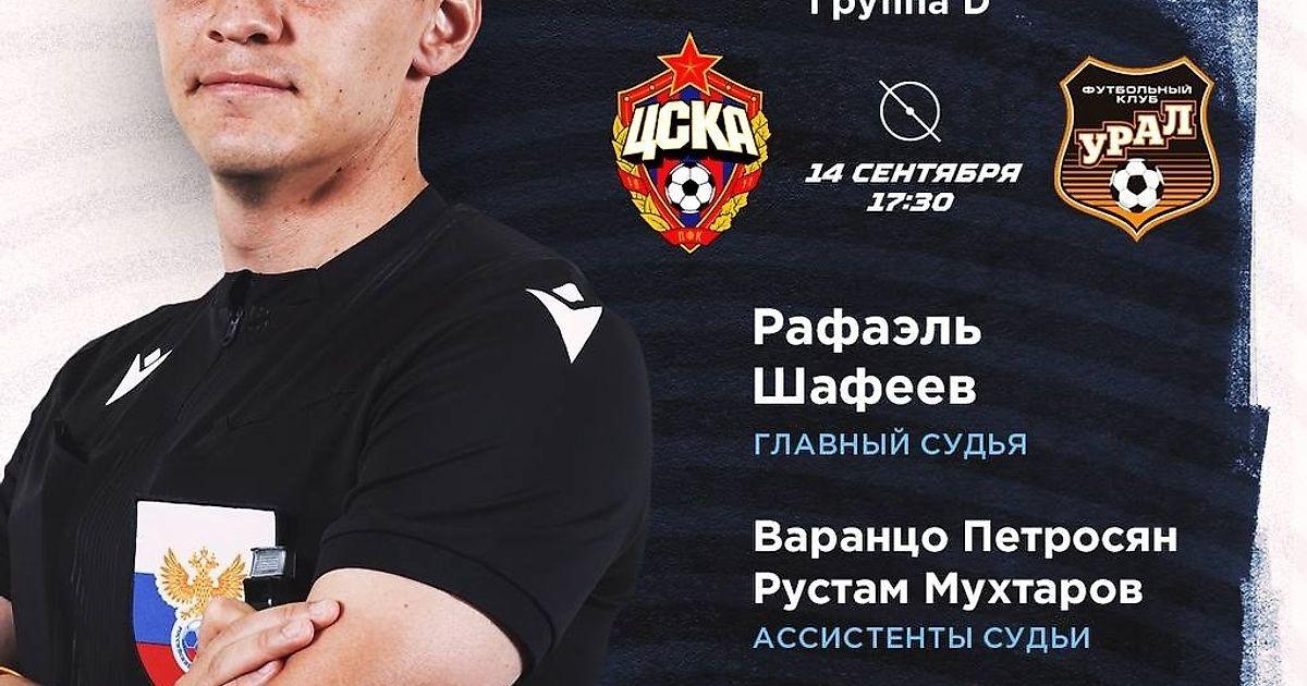 Рафаэль Шафеев назначен главным арбитром матча 2-ого тура группового этапа ФОНБЕТ Кубка России между ПФК ЦСКА и «Уралом»
