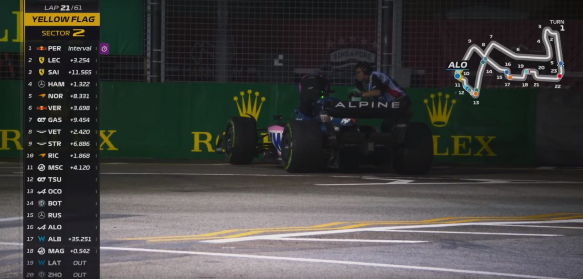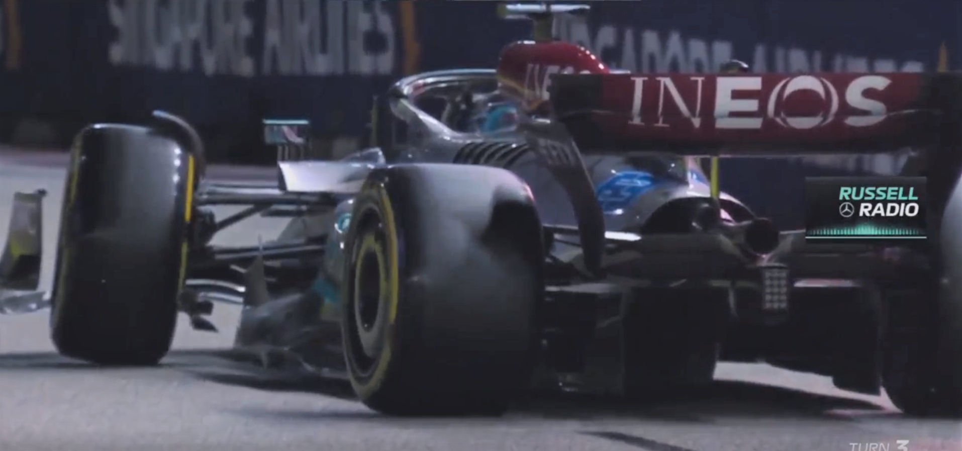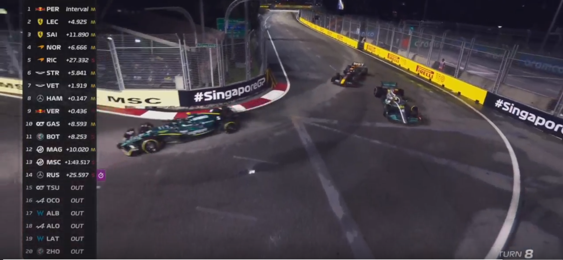 Сход произошел по техническим проблемам. Из-за этого появился виртуальный пейс-кар. На этом моменте стратеги "Мерседеса" решили всех удивить и переобуть Джорджа Рассела с промежутков на медиум. Видимо они решили что самое время показывать лучшие круги на сликах, но не тут та было. Вместо того, чтобы отыгрывать время и лететь на всех порах он выживал на этих шинах. Зрители в его исполнение могли наблюдать довольно красивый дрифт.