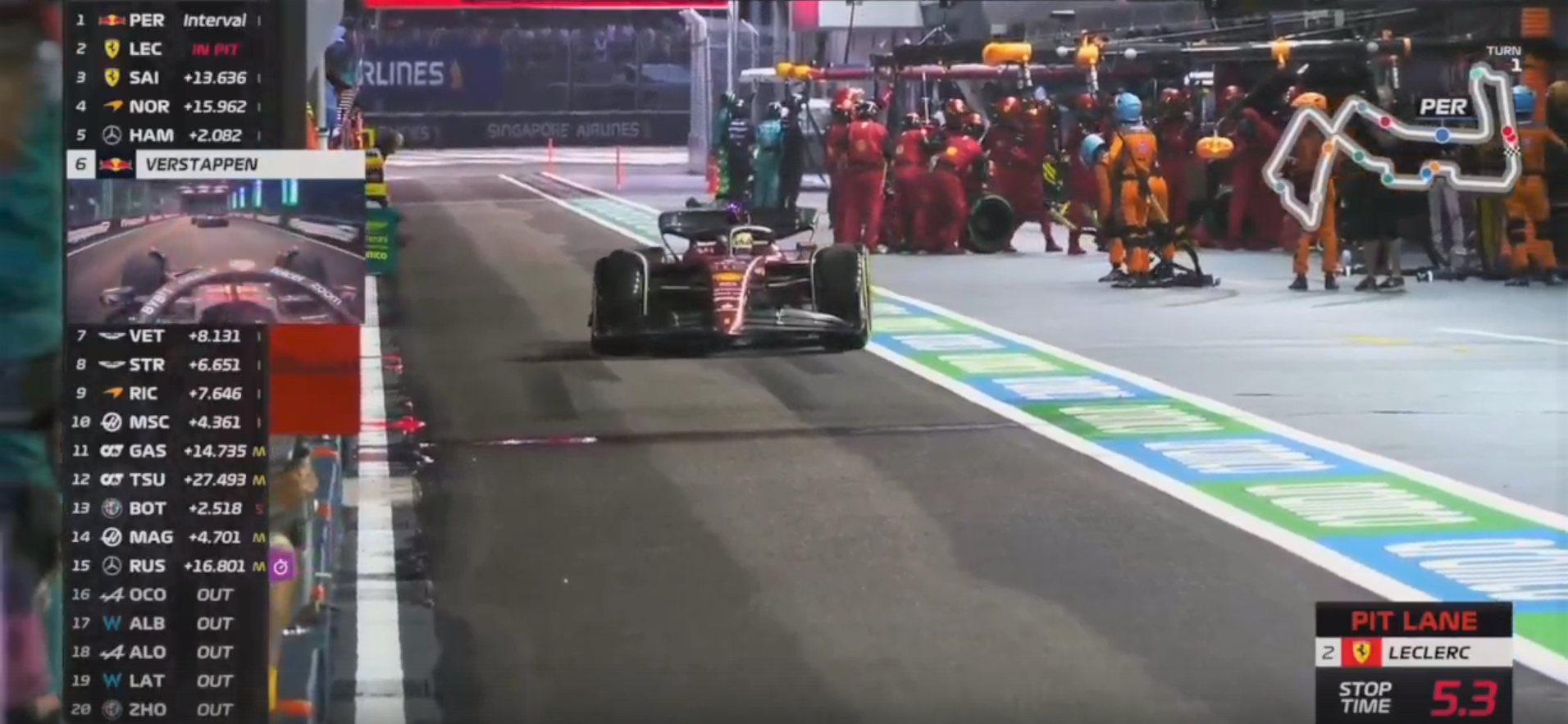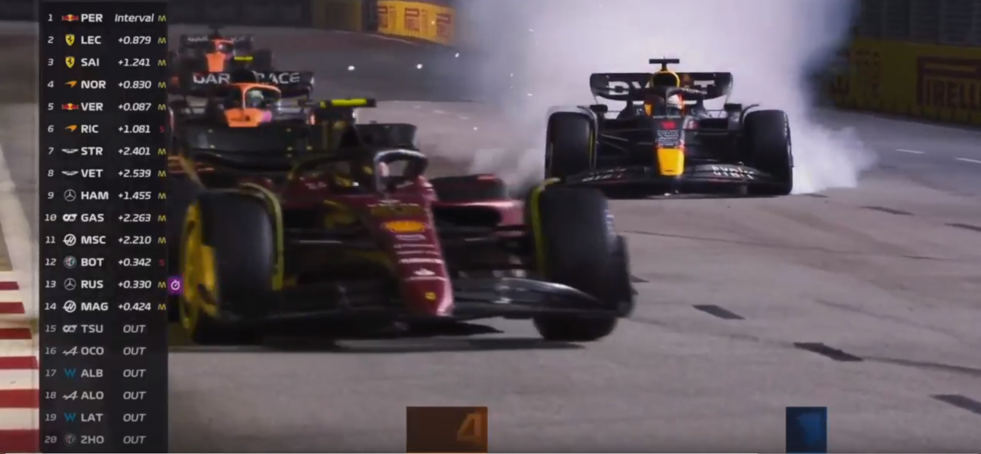 Пилот британского коллектива смог вернуться в боксы, но его также загнали в гараж, чтобы сберечь ресурсы машины. В гонке же кипела борьба между Серхио Пересом и Шарлем Леклером. Хочется сказать что вся борьба в пелетоне шла все еще на стартовых шинах, а уже на минуточку был 27 круг, почти половина гонки!!! Макс Ферстаппен легко расправился с "Астон Мартинами" и "Альфой Таури" Пьера Гасли, но на его пути встал упертый молодой британец Ландо Норрис. Гонщик "Макларена" ни в какую не пропускал действующего чемпиона мира. Их борьба вышла очень интересной, а чем же она закончилась, увидим позже. Льюис Хэмильтон прессинговал Карлоса Сайнса тоже уже очень давно, но из-за специфической конфигурации "Марины-Бэй", британец ни в какую не мог совершить обгон.