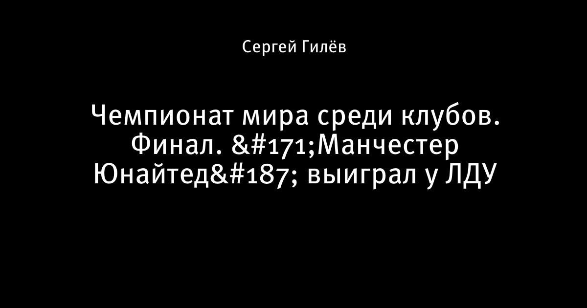 21 декабря 2008, 16:08 Чемпионат мира среди клубов. Финал. «Манчестер Юнайтед» выиграл у ЛДУ Финал.Манчестер Юнайтед  ЛДУ  1:0 1:0  Руни (72) Автор Сергей Гилёв Этот пост опубликован в блоге на Трибуне Sports.ru. Присоединяйтесь к крупнейшему сообществу спортивных болельщиков! Другие посты блога Разборки в олимпийском Париже
