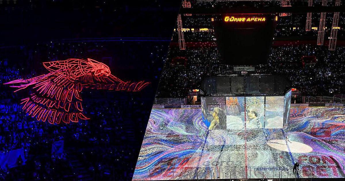 Историческая реконструкция создавалась не только благодаря видеопроекторам – но и с помощью фигуристов на льду. Кроме того, из-под сводов «G-Drive арены» спускались и специальные декорации в нужные эпохи.