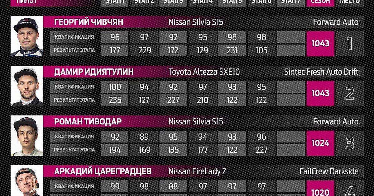 P.S.: Уже после написания статьи обратил внимание, что официальные источники RDS указывают Евгения Лосева как претендента на титул. Математически это действительно так, однако это очень маловероятный сценарий, так как для его осуществления сразу четыре пилота, про которых я подробно говорил в этой статье, должны плохо выступить в квалификации, либо не пройти её вовсе, а затем вылететь на стадии топ-32, если окажутся там. А сам Лосев при этом должен победить в этапе и занять место в топ-3 квалификации. Конечно, нет ничего невозможного: жизнь в целом и дрифт, в частности, бывают непредсказуемы, но всё же в такой расклад верится с трудом. Поэтому, при всём уважении к Евгению я не буду добавлять его в подробный разбор претендентов на чемпионство.