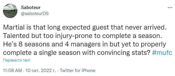 «Марсьяль — тот долгожданный гость, который так и не появился. Талантлив, но слишком подвержен травмам, чтобы завершить сезон. Он играл 8 сезонов и под руководством 4 тренеров, но не провел должным образом ни одного сезона с убедительной статистикой?»