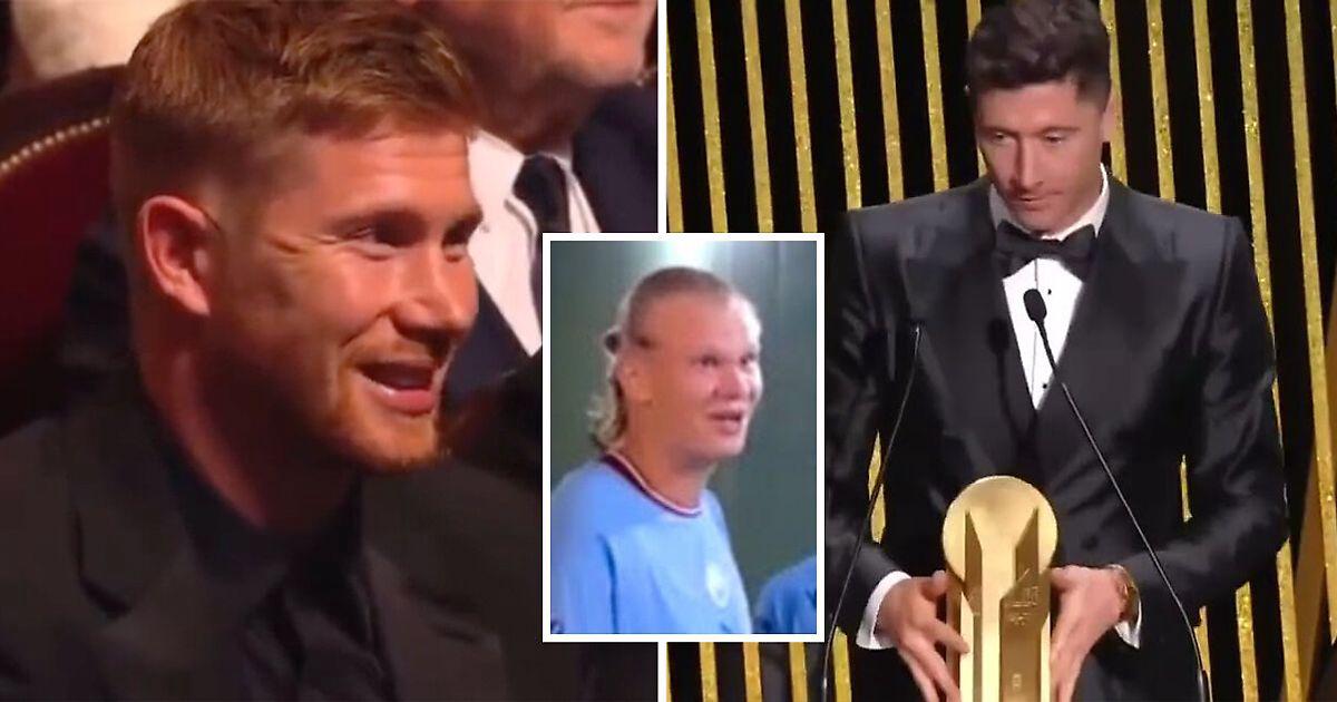 Операторы тут же выхватили лицо одноклубника Холанда Кевина Де Брюйне, который неловко улыбался – ведь вместо того, чтобы дать Роберту насладиться победой, ему зачем-то напоминают о конкуренте.