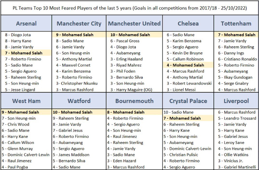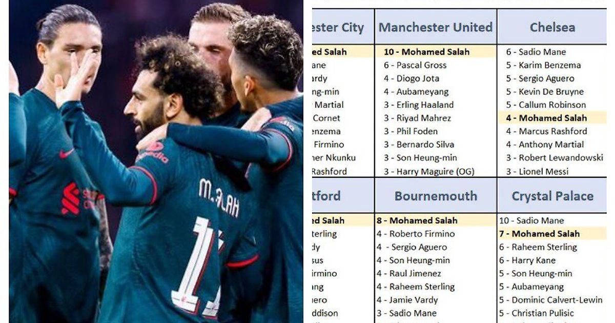 Салах – один из самых грозных снайперов чемпионата Англии. Из таблицы видно, что египтянин по статистике за 5 лет – лидер по голам сразу нескольким командам АПЛ, а забивал Мо вообще всем.