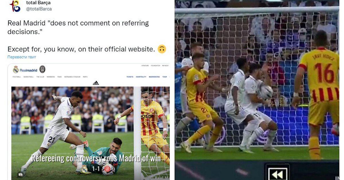 Это стало поводом для многочисленных злорадствующих комментариев в аккаунтах, связанных с «Барселоной». Все дело в том, что ранее руководители «Реала» не раз заявляли в прессе, что не обсуждают судейские решения, в особенности, когда дело касалось соперников. Теперь же несогласие с решениями судей появилось на главной странице официального сайта клуба.