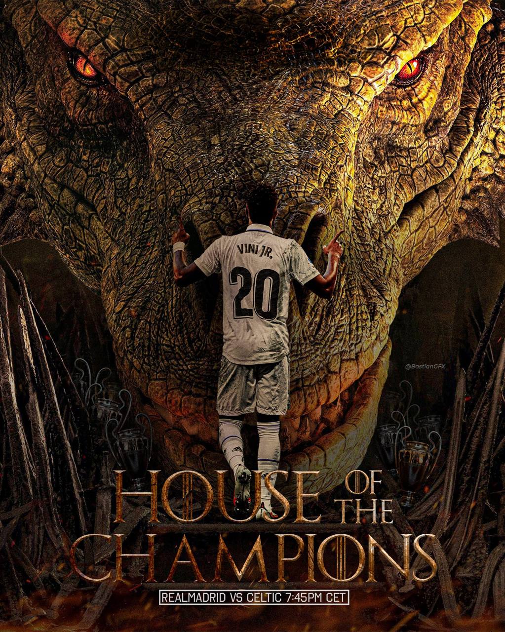 К матчу «Реала» с «Селтиком» выпустили афишу, стилизованную под сериал «Дом Дракона»: Винисиус занял место королевы