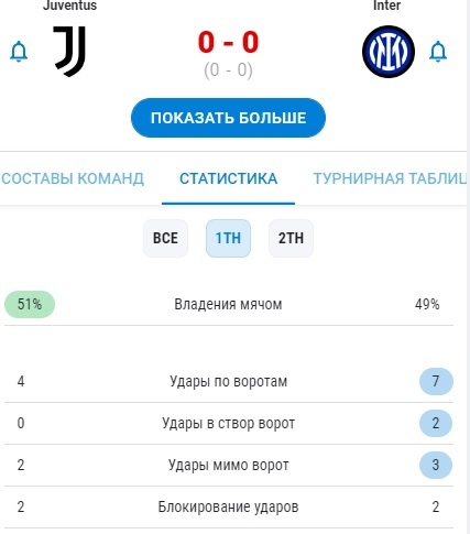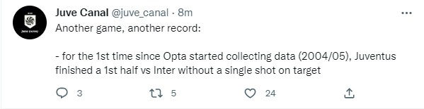 Впервые с сезона 2004/05 «Ювентус» завершил первый тайм с «Интером» не нанеся ни одного удара в створ ворот. При этом у миланского клуба уже 4 удара в активе.