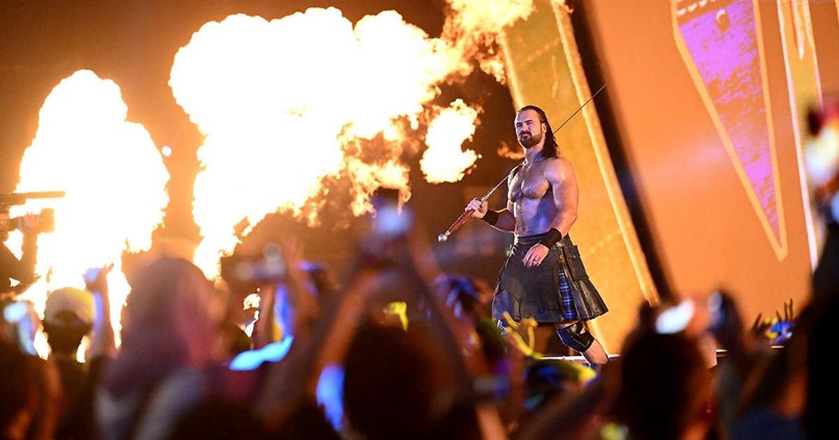 Скарлетт в очень закрытом латексном костюме сопровождала Кэрриона. В небе дроны выложили песочные часы. В общем, еще более пафосный выход у Кросса вышел, чем обычно. Во время выхода Дрю мы увидели и фейерверки и меч, выложенный все теми же дронами. Вообще, на этом особенные выходы не закончились, но об остальных, наверное, я больше упоминать не буду, если, конечно, кто-то на верблюде не поедет. Клетка опустилась, поединок начался, и рестлеры стали обмениваться ударами. Шотландец провел лэриэт, чоп, несколько ударов и бэк суплекс. Соперник ответил атакой горла, стал пытаться выбраться из клетки, и МакИнтайр прервал эту попытку. Борцы стали обмениваться ударами, стоя на канатах, и Кэррион обрушил визави причинным местом на этот самый канат. Тут же прошла серия страйков в углу, и Кросс провел эксплоудер. Затем Дрю был направлен головой в стену клетки, на что ответил серией чопов. Кросс еще раз запустил его лицом в стену клетки, не выпустив контроль из рук, а катапульта в нижний канат этот самый контроль только укрепила. Послушав нехорошие слова, МакИнтайр взорвался парой лэриэтов, провел оверхэд белли-ту-белли, пару раз впечатал недруга головой в стены и «шлифанул» это дело некбрейкером при попытки Кросса вернуться в бой. Future Shock Кросс избежал, и серия реверсов привела к Мичиноку Драйверу от Дрю до 2. Проведя еще один чоп, МакИнтайр усадил противника на третий канат, но суперплекс Кэррион заблокировал, усадив шотландца на канат… Естественно, для того, чтобы тот «взорвался» коронной вариацией спайдер суплекса. Claymore Кросс встретил неожиданным Busaiku Knee, чего для победы было мало.