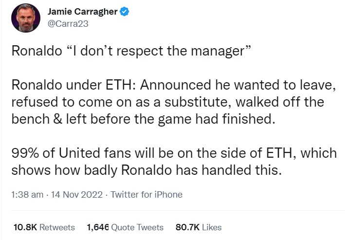 99% болельщиков «Юнайтед» будут на стороне Тен Хага, что показывает, как плохо Роналду проявил себя в этой ситуации», – написал Каррагер.