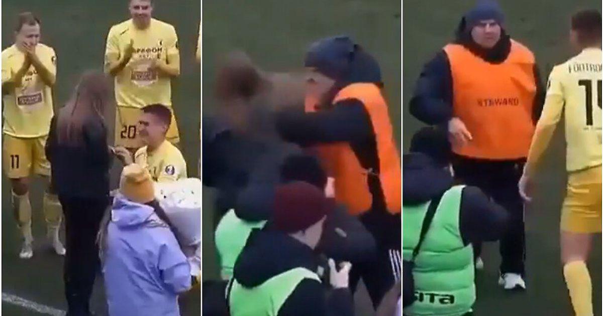 Прежде чем делать предложение на футбольном поле, лучше всех предупредить, а то невеста может «отхватить» от стюарда: так и случилось в чемпионате Беларуси