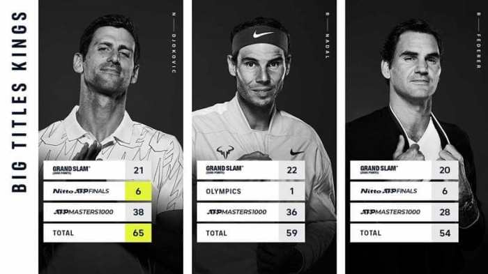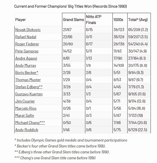 Показатель завоевания Джоковичем "Больших титулов" держится на уровне один трофей на каждые 3,2 сыгранных турнира (65/209), в то время как Надаль завоевывал один "Большой титул" на каждые 3,5 сыгранных им турниров (59/207). Единственными другими игроками, которые завоевывали "Большой титул" чаще, чем один раз за пять сыгранных турниров, являются Федерер (4,4, 54/240) и Пит Сампрас (4,9, 30/147).