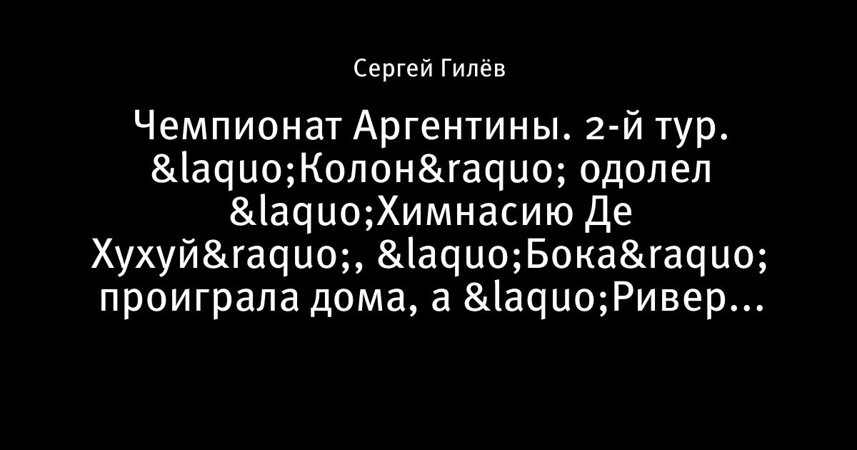 16 февраля 2009, 16:56 Чемпионат Аргентины. 2-й тур. «Колон» одолел «Химнасию Де Хухуй», «Бока» проиграла дома, а «Ривер Плейт» победил в гостях И другие матчи.Росарио Сентраль Ривер Плейт 1:2 Сан-Мартин Индепендьенте 3:0 Сан-Лоренсо Годой Круз 1:2 Бока Хуниорс Ньюэллс Олд Бойс 0:2 Велес Сарсфилд Аргентинос Хуниорс 1:1 Банфилд Эстудиантес 1:0 Расинг Хуракан 1:4 Колон Химнасия Де Хухуй 1:0 Арсенал Тигре 2:0 Автор Сергей Гилёв Этот пост опубликован в блоге на Трибуне Sports.ru. Присоединяйтесь к крупнейшему сообществу спортивных болельщиков! Другие посты блога Разборки в олимпийском Париже