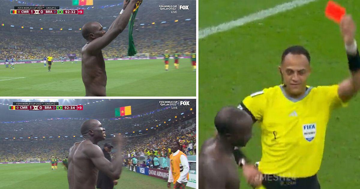 Реакция камерунца на удаление в матче с Бразилией: он забыл, что у него есть желтая, и снял футболку после гола