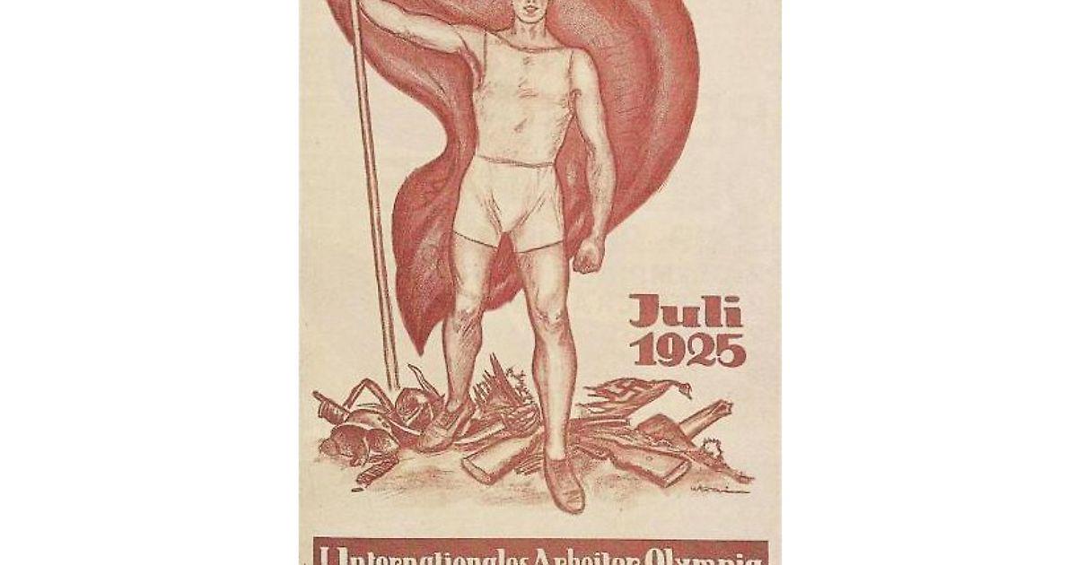 Плакат I Международных Рабочих Олимпийских игр (I. Internationales Arbeiter-Olympia) во Франкфурте-на-Майне (художник Виллибальд Крайн) со словами из «Интернационала» (международный пролетарский гимн; автор слов Эжен Потье) «Debout! les damnés» ([дэбю ле дани] / Вставайте, проклятые!) на красном знамени