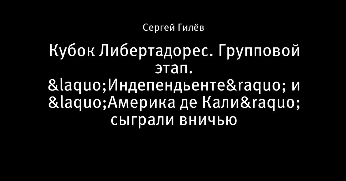 11 марта 2009, 14:10 Кубок Либертадорес. Групповой этап. «Индепендьенте» и «Америка де Кали» сыграли вничью 10 марта.Группа 4 Америка де Кали Индепендьенте Медельин 1:1 Группа 5 Депортиво Кито Эстудиантес 1:0 Автор Сергей Гилёв Этот пост опубликован в блоге на Трибуне Sports.ru. Присоединяйтесь к крупнейшему сообществу спортивных болельщиков! Другие посты блога Разборки в олимпийском Париже