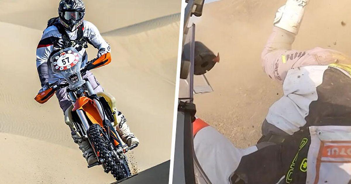 Суть «Дакара» в 40 секундах: мотогонщик грохнулся через голову, выругался, извинился перед байком и поехал дальше