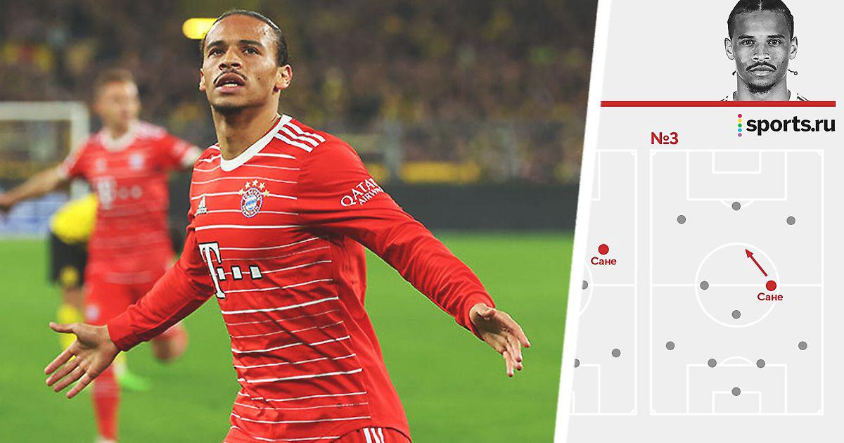 В тексте о нападении «Баварии» без Левандовского мы проговаривали, что у Сане есть очевидный талант плеймейкера, просто это не совсем классическая десятка. Он хорошо предлагает себя в заполненной центральной оси, включается в стенки, иногда дает обостряющие за спины, но при этом еще и взрывается в дриблинге. Логично, что такому игроку жизненно важно иногда сваливаться на фланг.