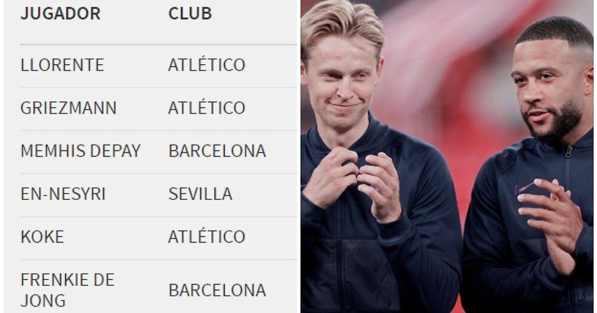 Список возглавили Маркос Льоренте и Антуан Гризманн из «Атлетико», а рядом с ними − Мемфис Депай из «Барселоны» и Юссеф Эн-Несири из «Севильи», которые вчетвером потеряли по 25 млн евро своей стоимости. Что интересно, за год цена Гризманна уполовинилась − с 50 млн евро до 25.
