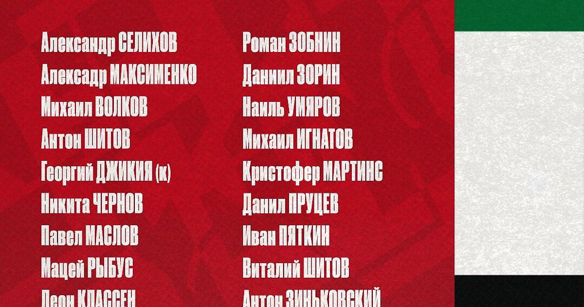 Главный тренер Гильермо Абаскаль включил в состав делегации 27 футболистов. Это вратари — Михаил Волков, Александр Максименко, Александр Селихов и Антон Шитов; защитники — Максим Веденеев, Георгий Джикия, Дмитрий Иванников, Леон Классен, Павел Маслов, Мацей Рыбус и Никита Чернов; полузащитники — Даниил Денисов, Антон Зиньковский, Роман Зобнин, Даниил Зорин, Михаил Игнатов, Руслан Литвинов, Кристофер Мартинс, Данил Пруцев, Иван Пяткин, Наиль Умяров, Даниил Хлусевич и Виталий Шитов; нападающие — Кейта Бальде, Павел Мелёшин, Шамар Николсон и Александр Соболев.