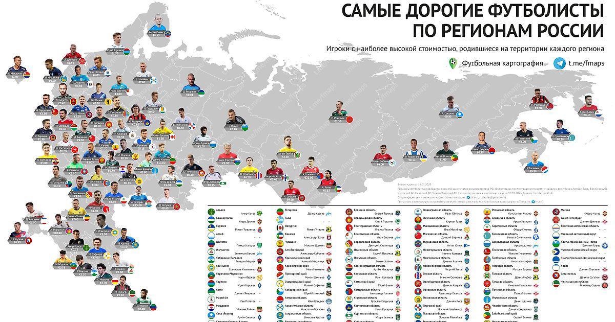 Самый дорогой футболист Санкт-Петербурга играет в «Спартаке», уроженцы Калмыкии и Бурятии — в Корее и Испании, а родившиеся в Кемеровской и Владимирской областях — во Франции и Греции. Находите множество других интересных и любопытных фактов.