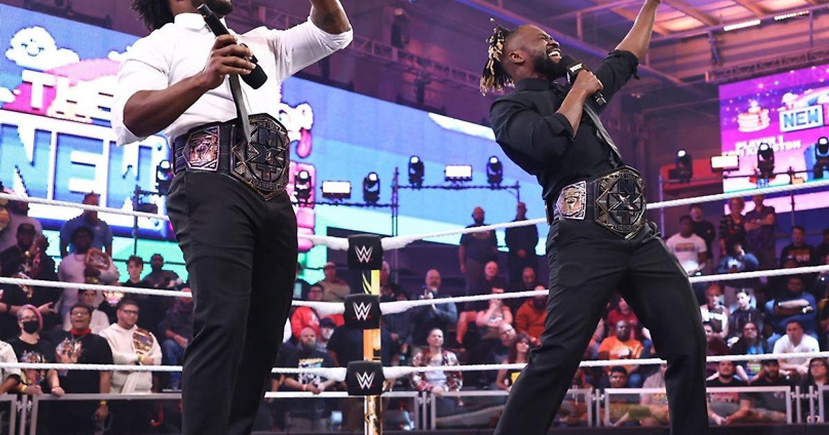 Командные чемпионы Новый День появились в рубашках и при галстуках, у нас была новость почему. Публика встретила Кофи и Вудса тепло. Последний представил себя и напарника, отметив, как они хорошо выглядят. Почему? Кингстон сказал. Потому что они разделались с Pretty Deadly. Но если не от PD, то от кого чемпионы будут защищаться на Vengeance Day? Ответ прост: от победителей гаунтлет-матча на прошлой неделе Gallus. Этот анонс прервало появление Кита Уилсона и Элтона Принца. Элтон предложил прекратить эту клоунаду. Новый День позорят себя, несут чушь, а PD ненавидят чушь. Новый День издеваются над британцами, неужели они считают, что это смешно? Экзевьер ответил, что по его мнению (которое совпадает с мнением фанатов), это уморительно. Кофи сказал, что еще смешнее поражение Кита и Элтона на прошлой неделе. Вудс же заметил, что если бывшие чемпионы принесли бы все, что было в списке Нового Дня, то не пришлось бы даже в гаунтлете участвовать. Pretty Deadly заткнули Кофи и Вудса, сказав, что целый месяц сталкивались с кучей препятствий из-за Нового Дня, и это нечестно. Кингстон тут же понял, что у них с товарищем была такая уникальная возможность заставить PD в прямом смысле слова прыгать через препятствия. Но Уилсон и в этот раз прервал чемпионов, сказав, что Pretty Deadly, а не Gallus законные претенденты на пояса. Все это знают. И тут появились Марк Коффи и Вольфганг.
