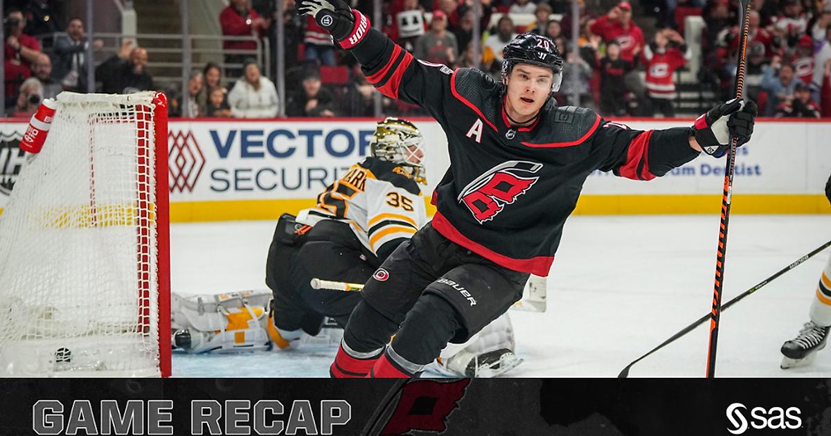 "Каролина Харрикейнз"-"Бостон Брюинз" 4:1.Себастьян Ахо,Пол Штясны.Сет Джарвис и Джордан Стаал забросили по шайбе,Фредерик Андерсен отразил 24 броска."Ураганы" выиграли 5 игру подряд.