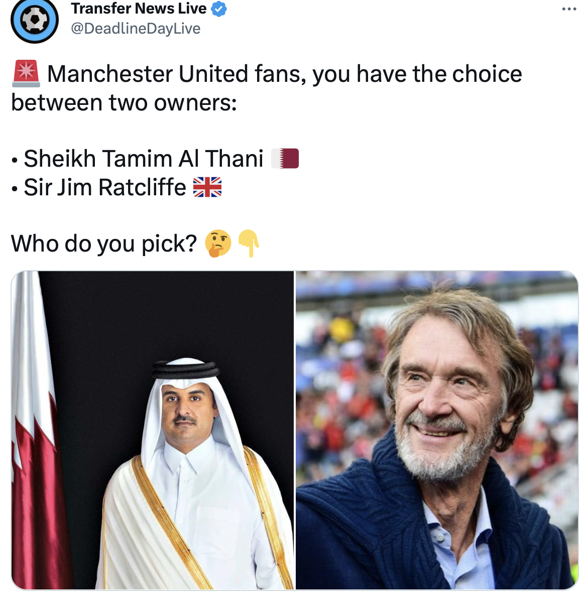 Твиттер-канал «Transfer News Live» провел опрос среди фанатов «Ман Юнайтед» на тему «Кого бы они предпочли видеть своими новыми владельцами».