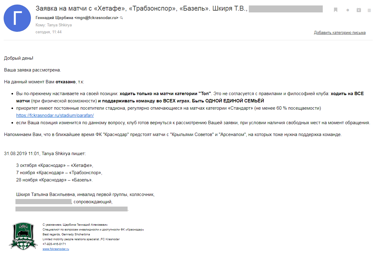 Например, специалист по вопросам инвалидности и доступности ФК «Краснодар» Геннадий Щербина отказал колясочнице Татьяне Шкиря в посещении трех топовых матчей при наличии свободных мест для колясочников, потому что «Это не согласуется с правилами и философией клуба: ходить на все матчи и поддерживать команду во всех играх. Быть одной единой семьей». Ранее Геннадий Щербина также под различными незаконными предлогами запрещал Татьяне посещать и рядовые матчи.