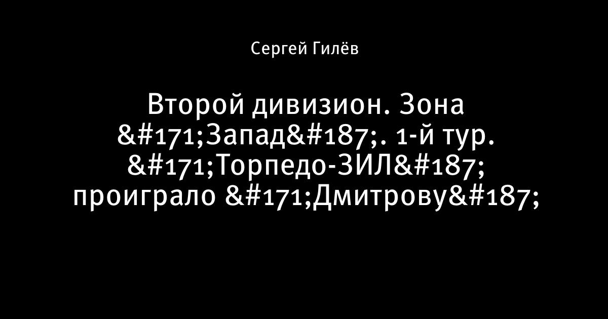 19 апреля 2009, 01:11 Второй дивизион. Зона «Запад». 1-й тур. «Торпедо-ЗИЛ» проиграло «Дмитрову» 18 апреля.Торпедо-ЗИЛ Дмитров 0:1 Автор Сергей Гилёв Этот пост опубликован в блоге на Трибуне Sports.ru. Присоединяйтесь к крупнейшему сообществу спортивных болельщиков! Другие посты блога Разборки в олимпийском Париже