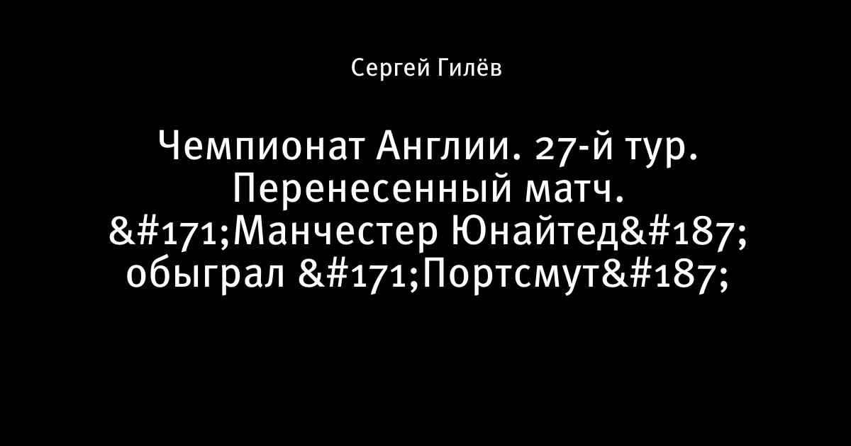 22 апреля 2009, 23:49 Чемпионат Англии. 27-й тур. Перенесенный матч. «Манчестер Юнайтед» обыграл «Портсмут» 27-й тур. Перенесенный матч. Манчестер Юнайтед Портсмут 2:0 1:0 Руни (9), 2:0 Кэррик (82) Автор Сергей Гилёв Этот пост опубликован в блоге на Трибуне Sports.ru. Присоединяйтесь к крупнейшему сообществу спортивных болельщиков! Другие посты блога Разборки в олимпийском Париже