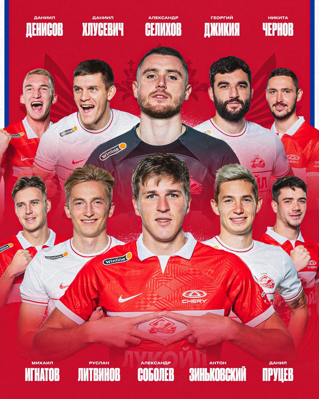 В списке десять спартаковцев. Это вратарь Александр Селихов, защитники Даниил Хлусевич, Георгий Джикия, Даниил Денисов и Никита Чернов, полузащитники Антон Зиньковский, Данил Пруцев, Руслан Литвинов и Михаил Игнатов, а также нападающий Александр Соболев.