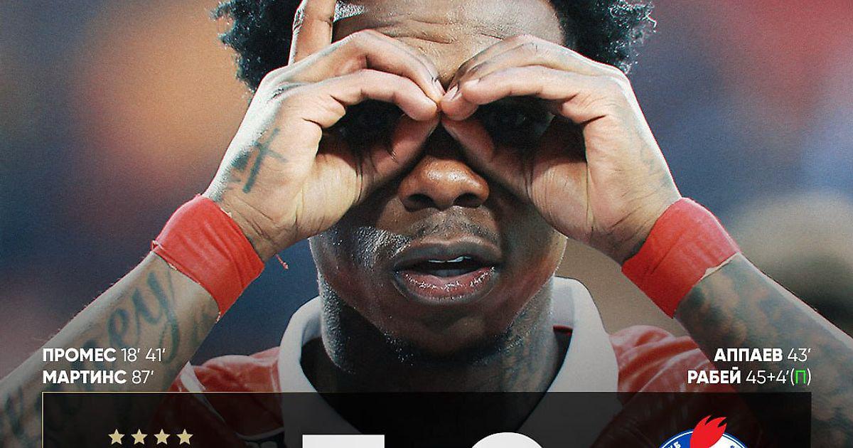 Встреча в Москве завершилась со счетом 3:2. В составе «красно‑белых» Квинси Промес оформил дубль, еще один мяч на счету Кристофера Мартинса. За гостей отличились Хызыр Аппаев и Реда Рабей, реализовавший пенальти.
