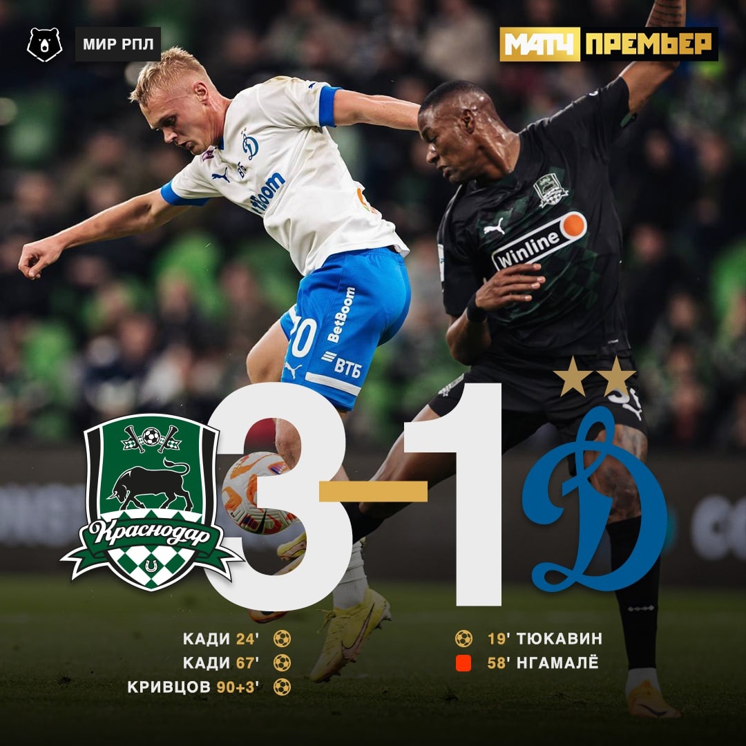 Шварц и компания уехали из Краснодара ни с чем, при этом начали резво, забил Тюкавин, у молодого форварда «Динамо» уже пять баллов по гол+пас в последних пяти матчах РПЛ (4 гола и 1 передача), он проводит свой самый результативный сезон в карьере (7 голов). Но потом в игру вошел новичок «быков» Кади Боржес, оформив дубль. Кривцов же просто поставил точку в концовке. Так и разошлись.