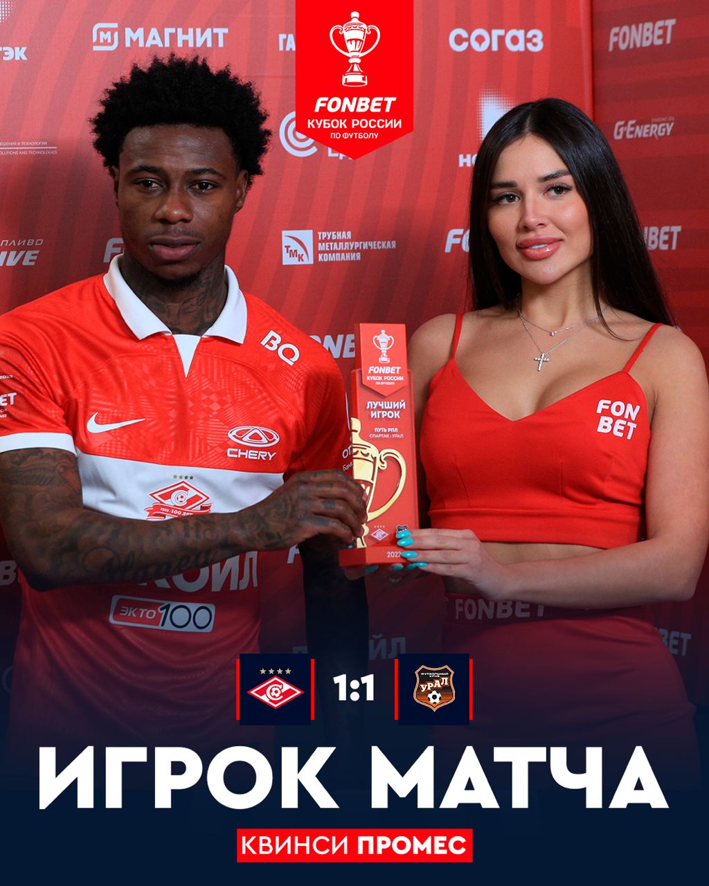 Полузащитник московского «Спартака» Квинси Промес признан лучшим игроком первого матча полуфинала Пути РПЛ ФОНБЕТ Кубка России с екатеринбургским «Уралом».