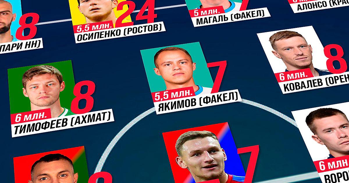 Больше всех из страйкеров, кто бы мог подумать, набрали Дзюба (8 млн, Локомотив) и Воробьёв (6 млн, Оренбург) - по 8 очков. Чалов (7,5 млн, ЦСКА) тоже удивил - его гол «Зениту» не был прогнозируемым. В итоге у нападающего армейцев - 7 ФО.