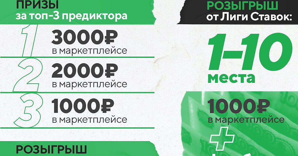 А лучшие десять игроков, кто зарегистрирован на Лиге Ставок, получат промокод на 1000 рублей в маркетплейсе + фрибет 1000 рублей в Лиге Ставок!