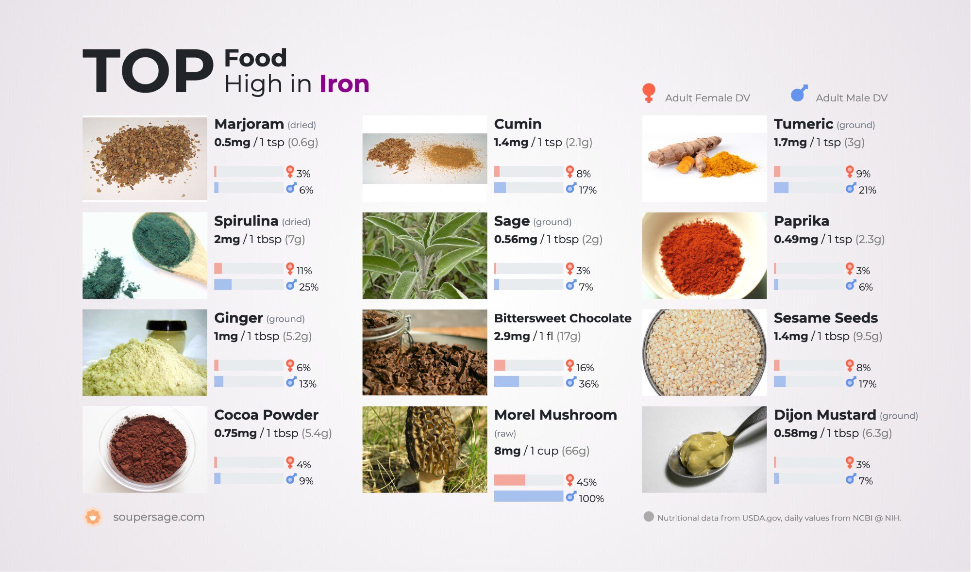 Лучшими источниками железа являются красное мясо, печень, моллюски, фасоль, шпинат, тыквенные семечки, изюм и темный шоколад.