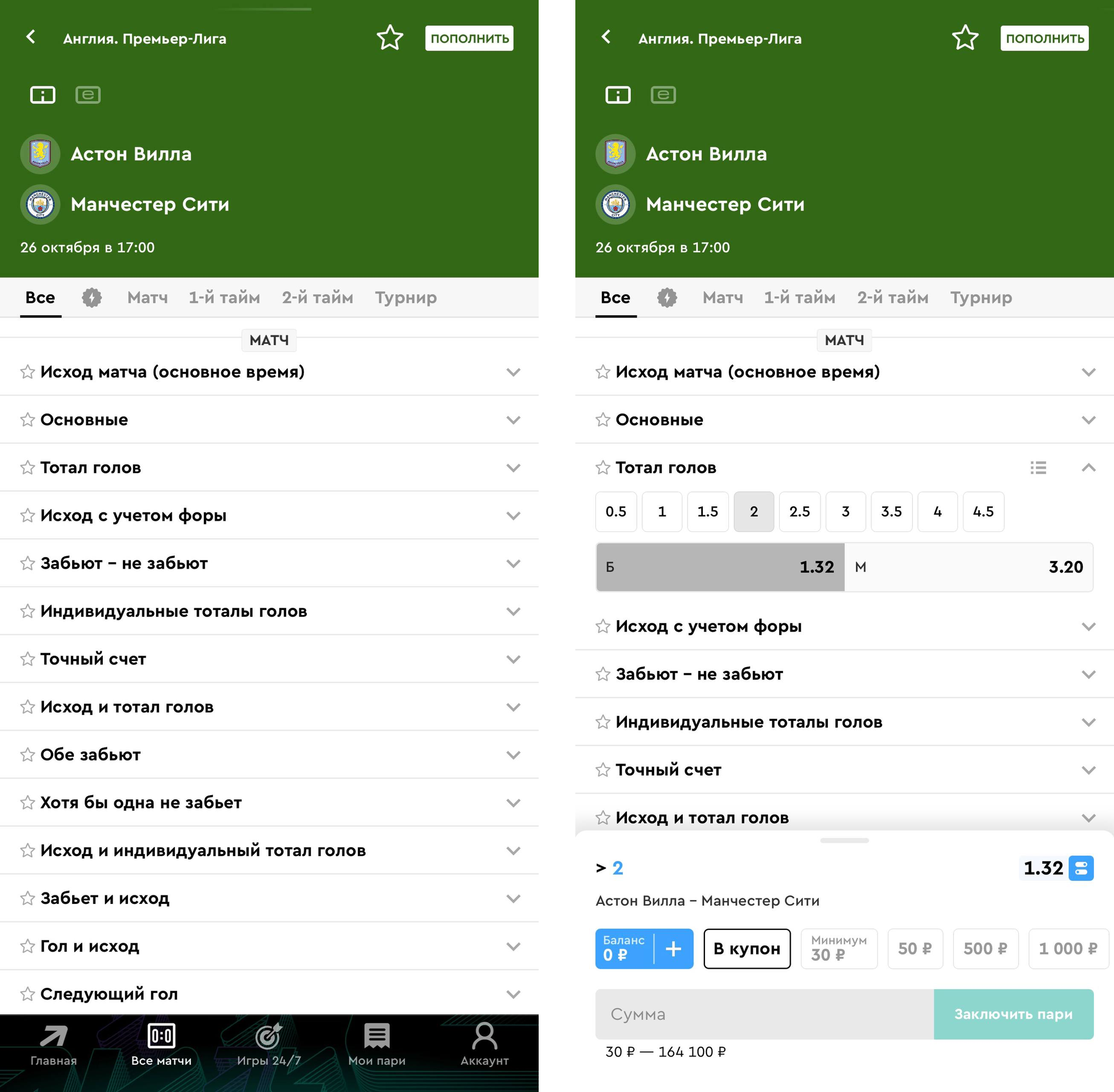 Пример №1. Классический пример ставки на общую результативность. Матч АПЛ «Астон Вилла» – «Манчестер Сити». Открываем роспись и видим, что ставка «тотал 2 Б» предлагается за коэффициент 1.32. Варианты расчета пари: