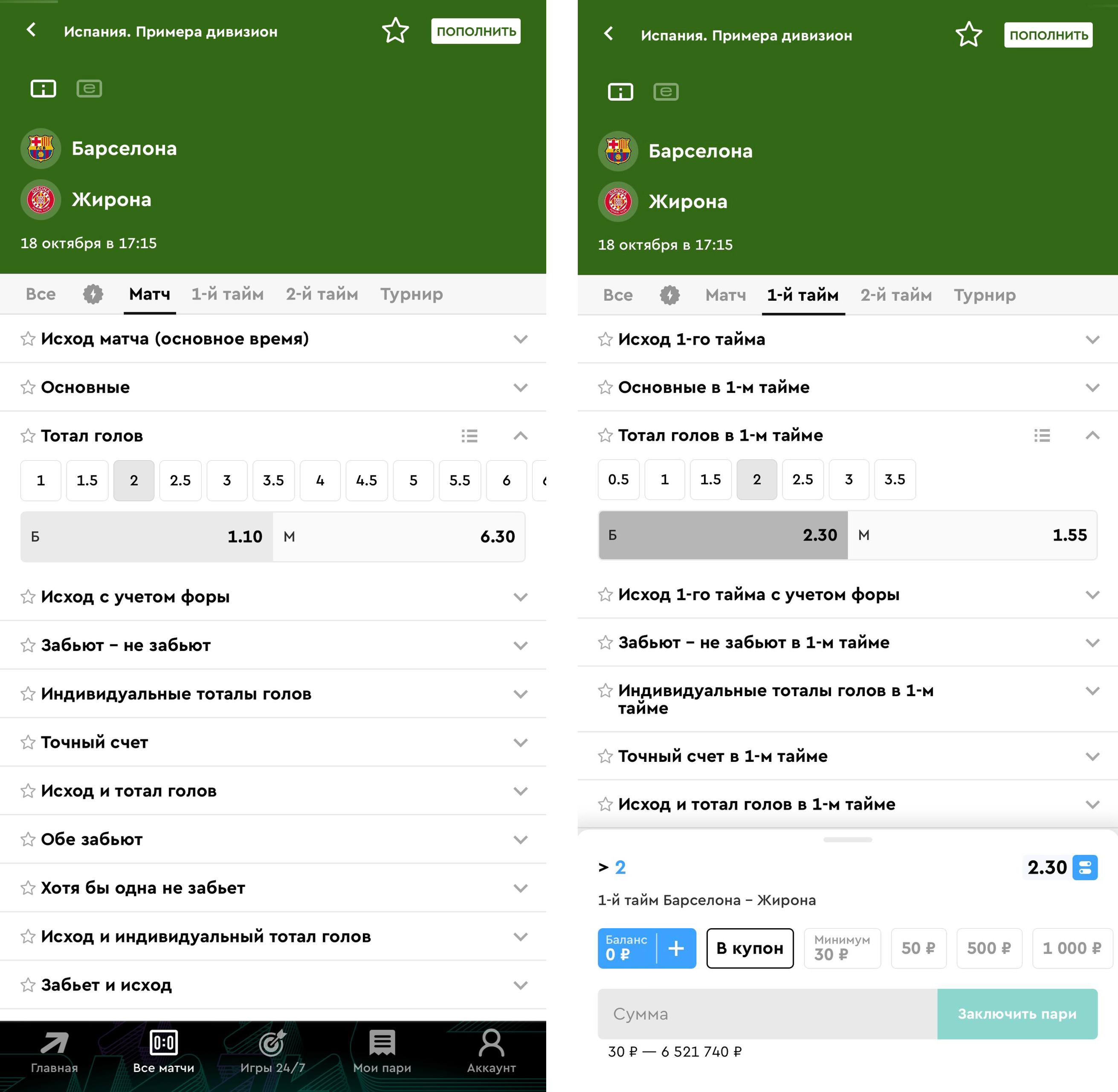 Поскольку в футболе ставка на тотал (2) используется наиболее часто и для разных рынков, то и примеров здесь будет больше всего.
