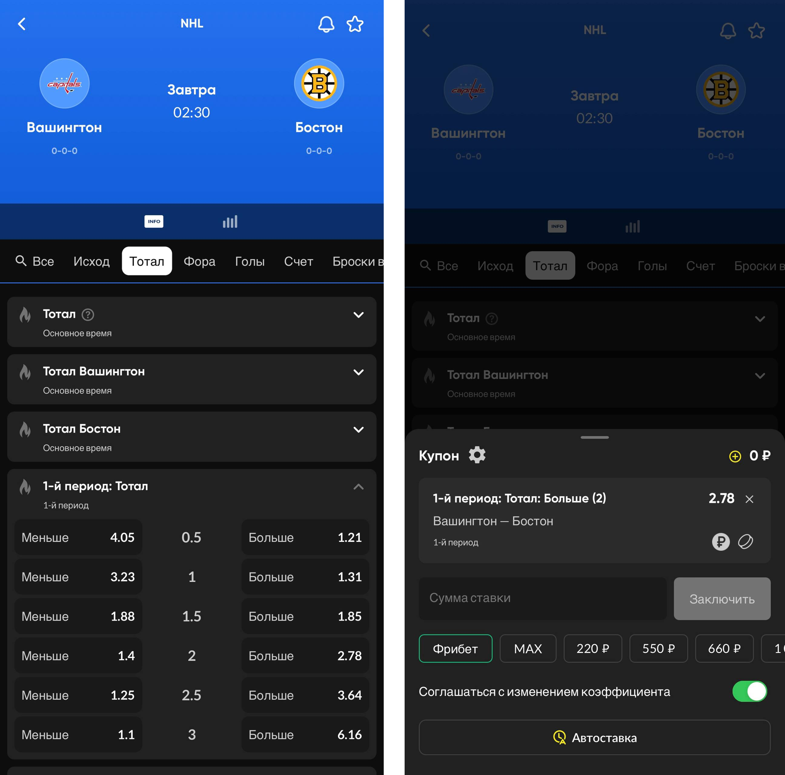 Матч НХЛ «Вашингтон» – «Бостон». Тотал 2 предлагается в каждом из периодов. Допустим, вы выбрали ставку ТБ (2) в 1-м периоде за коэффициент 2.78. Ставка сыграет, если команды на двоих забросят за стартовые 20 минут 3 и более шайбы. Если будет ровно 2 гола – возврат, если 0 или 1 – проигрыш пари.