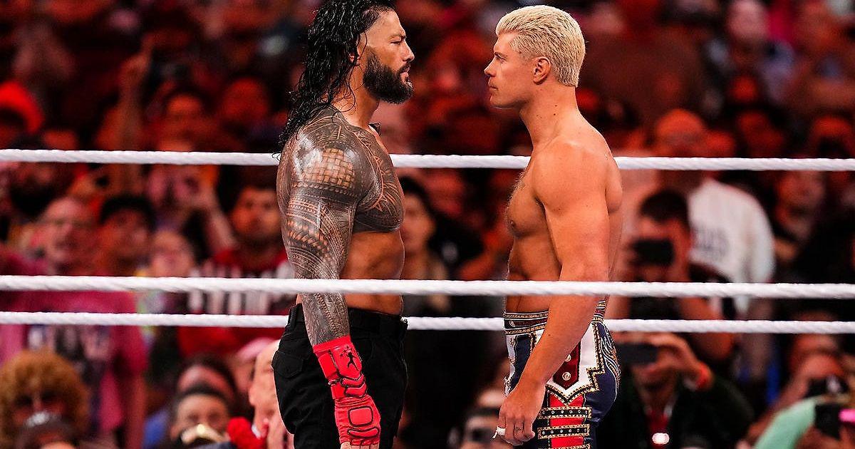 Коди во время выхода встретили как человека, который покинет это шоу с поясами чемпиона мира. Выходя на ринг, он пообщался с сестрой, женой, мамой и сестрой и Броди Ли-младшим, которые стояли в первом ряду. Роман выходил под фортепианный аккомпанемент. Его сопровождали Соло Сикоа и Пол Хейман. Взяв микрофон, Роман Рейнс потребовал у WrestleMania признать себя. Гонг прозвенел. Рестлеры посмотрели пристально друг другу в глаза, и начали ходить кругами. Стартовый лок-ап. От хэммерлока чемпион спасся, схватившись за канат, после чего состоялся еще один лок-ап, и претендент применил хэдлок. Рейнс попытался отбиться, но обнаружил себя на земле, а десятки тысяч чантили «Cody!». Роман отбился, но Роудс провел пару коронных страйков, и чемпион отправился за пределы ринга, чтобы немного успокоиться. Пол Хейман наговорил хороших вещей «Вождю Племени», и самоанец поднялся в четырехугольник. Чейн-рестлинг продолжился, Роман провел жесткий бэк элбоу, затем еще один, и показалось, что он захватил контроль. Серия клоузлайнов в углу, и Коди ушел от биг бута, шарахнув биг бут до 1.